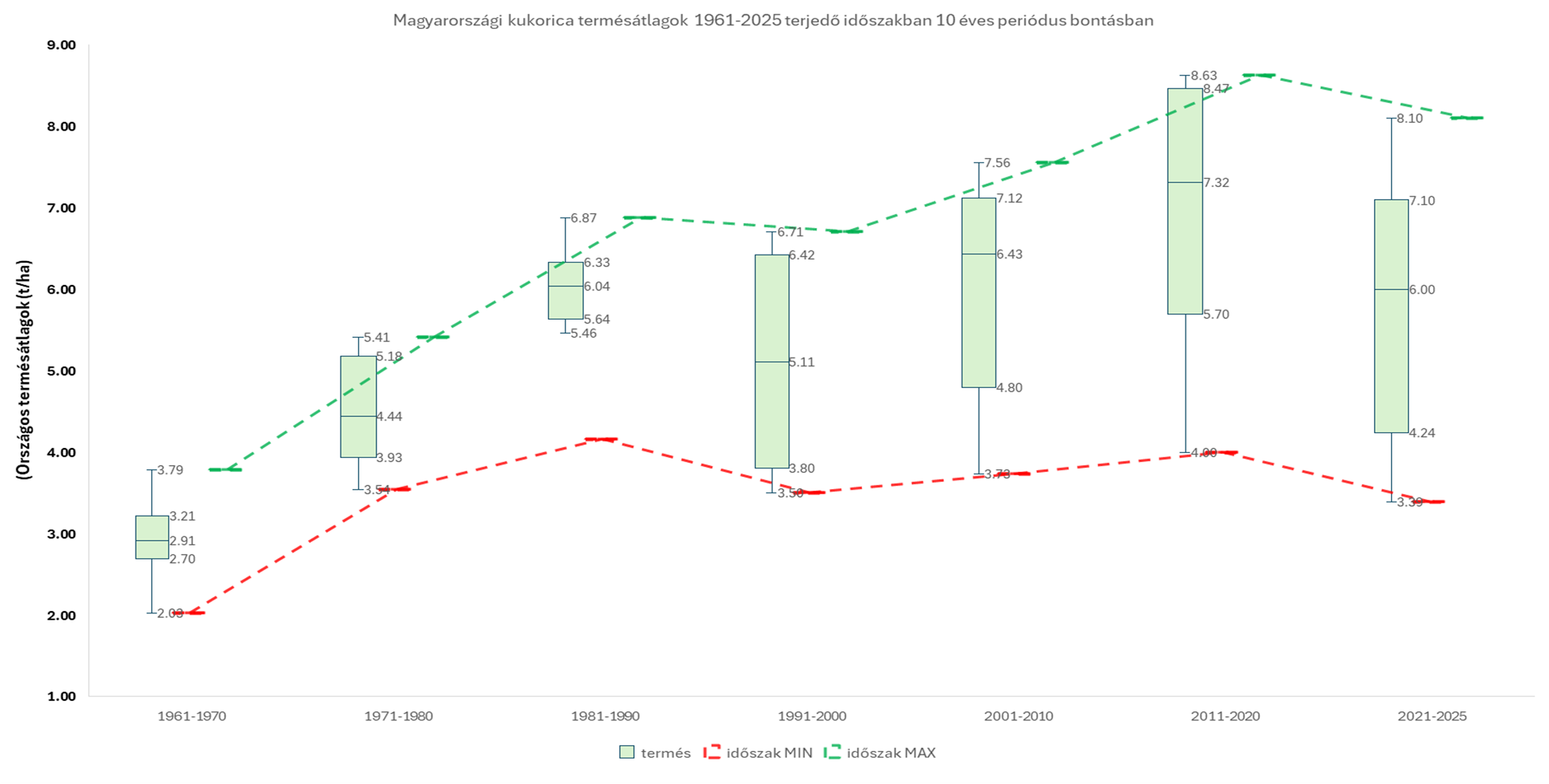 Az ezredfordulótól mérhető és kimutatható a termésátlagok nagymértékű ingadozás. A szélsőértékek kilengése a 10 éves periódusokban is megfigyelhető ez nagy valószínűséggel a klimatikus átrendeződésnek tudható be. Az előrejelzések ennek az ollónak a további nyílását prognosztizálják. (2. ábra)