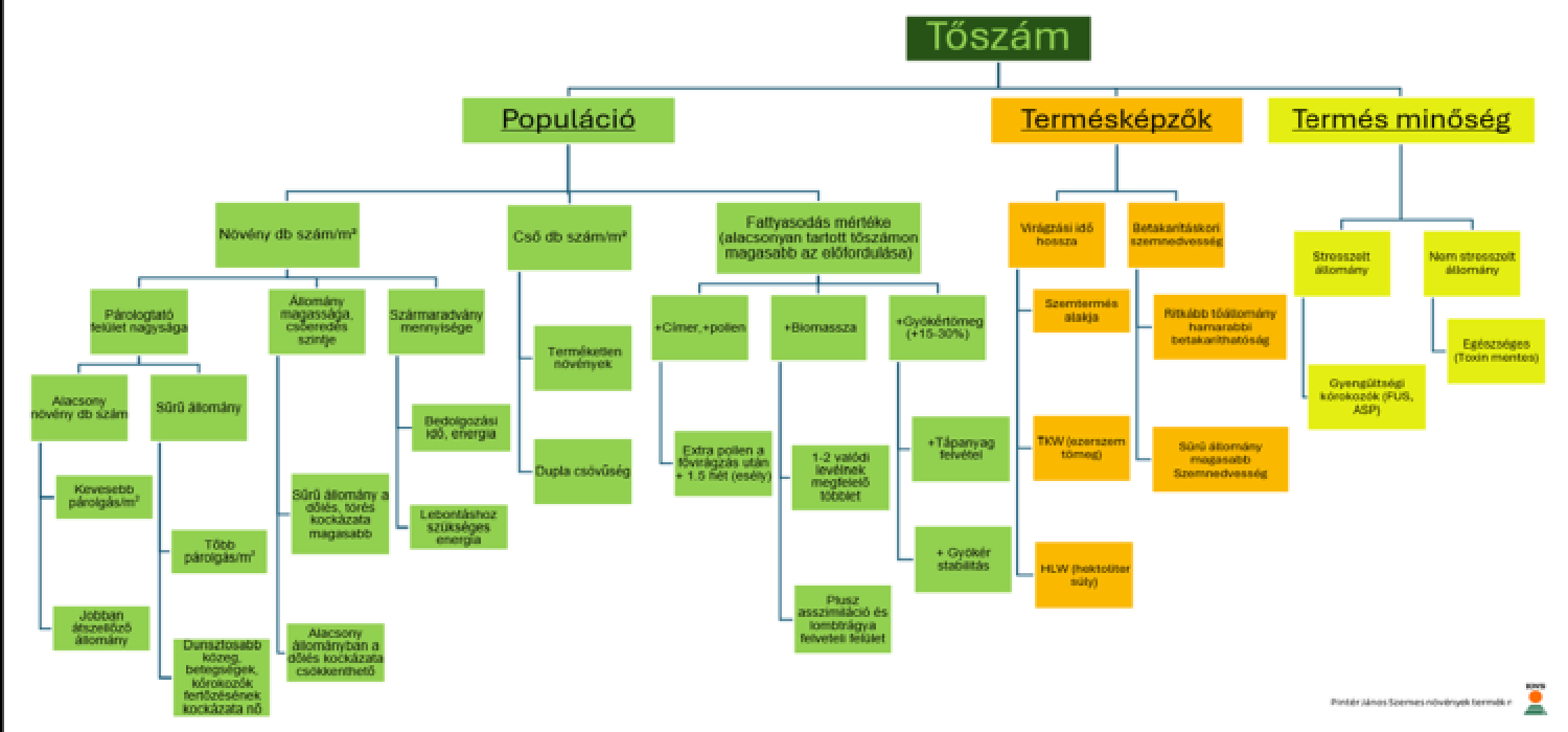 A tőszámjavaslat nem általánosítható és futtatható egy sémára. Számos egymással szoros kapcsolatban lévő elem vált ki újabb hatásokat, ami egyedivé teszi és felértékeli a súlyát a tőszám tervezés során. A lenti összefoglaló táblázat néhány összefüggést szemléltet, ami a tőszám direkt hatásait a populációra és közvetett hatásait a termésképzőkre és a termés minőségére utal. (4. ábra)
