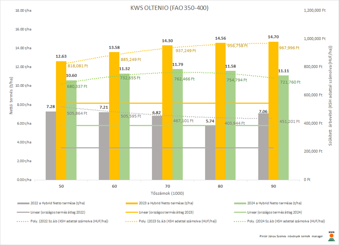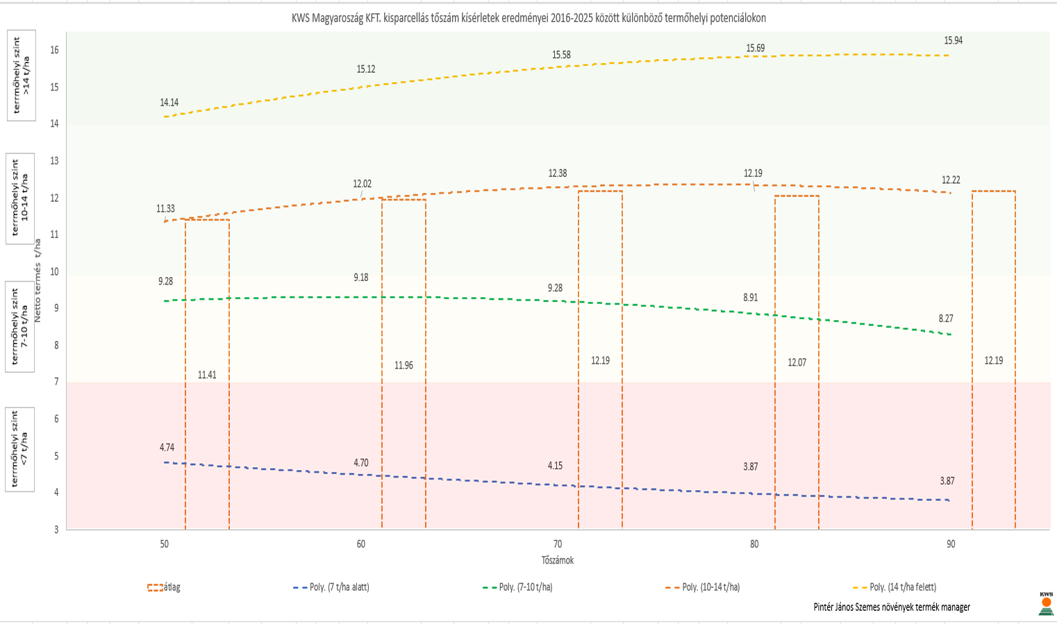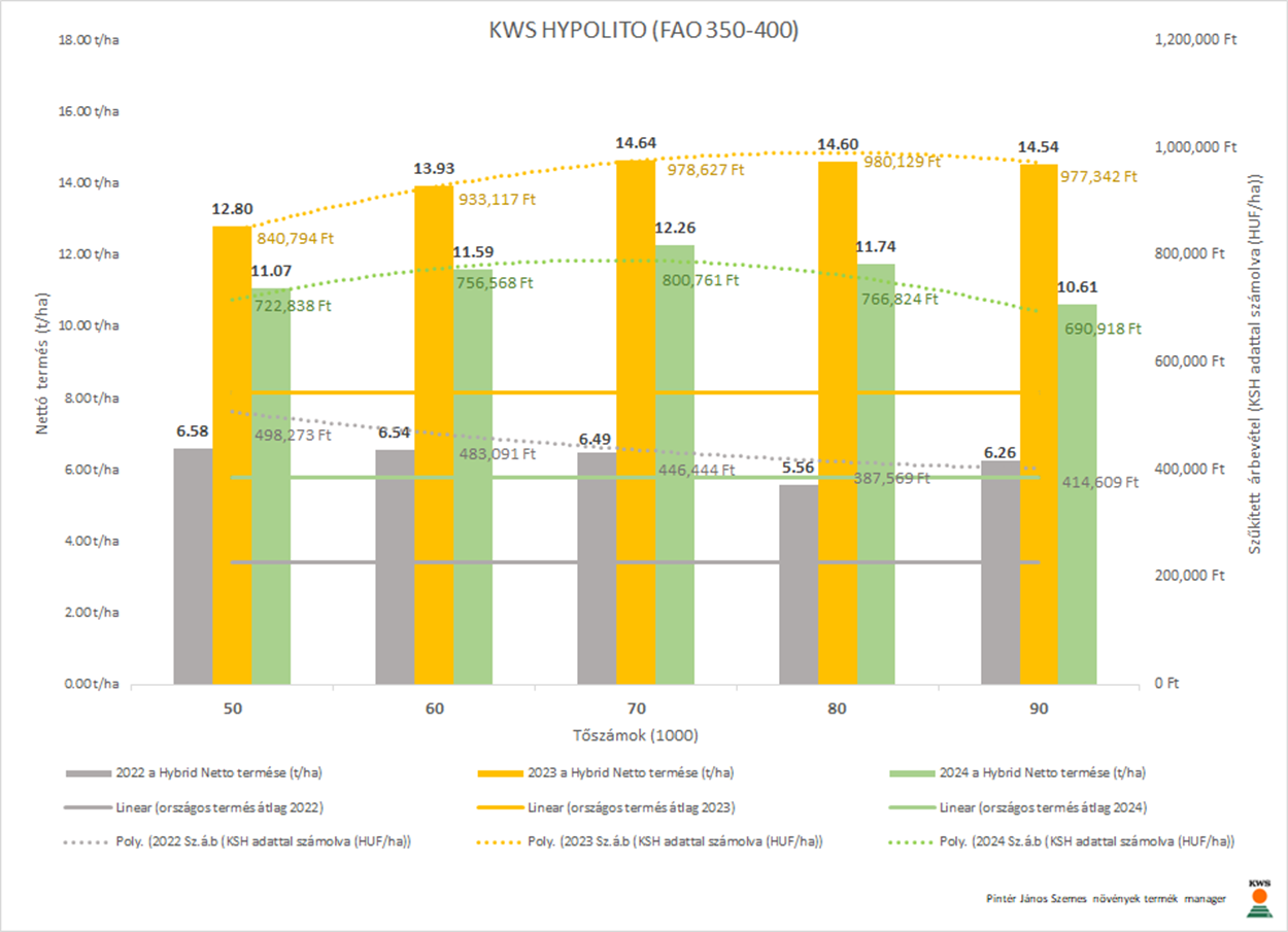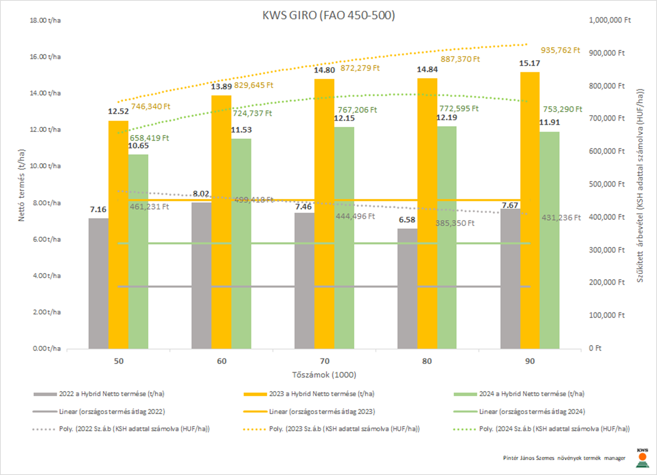 Magyarországra legjellemzőbb ~7-9 t/ha intervallum egy választó vonal, ahol a KWS FORTURIO (FAO350-400) és a KWS GIRO (FAO450-500) a 7.5 növény/m² a KWS OLTENIO (FAO350-400) és a KWS HYPOLITO (FAO350-400) a 7 növény/m² javasolt tartani.
