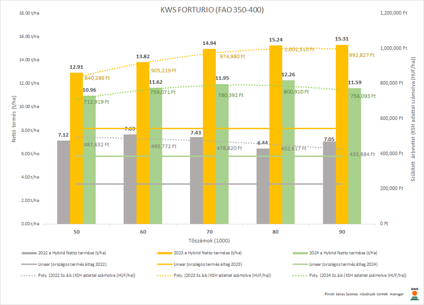 A 2023-as év „klasszikus év” (7.96 t/ha országos termésátlag ~68.000 HUF kukorica felvásárlási ár) azt mutatja, hogy a KWS TOP4 hibridek mindegyikénél a tőszám növelése termés többletet a betakarításkori szemnedvességek csökkenésén keresztül magasabb jövedelmet realizált. KWS FORTURIO (FAO350-400) saját átlagához képest 8 növény/m² tőszámon 15.04 %-s betakarításkori szemnedvességnél 1001513.25 HUF-t ért el, ami a saját átlagán felüli +6%-t produkált. Szintén ebben az évben a KWS FORTURIO (FAO350-400) adta a legmagasabb termést a Debreceni Egyetem 2023 Agrotechnikai Potenciál kísérletekben – messze megelőzve a teljes mezőnyt – 20,09 t/ha nettó terméssel és 16,69%-os betakarításkori szemnedvességgel.