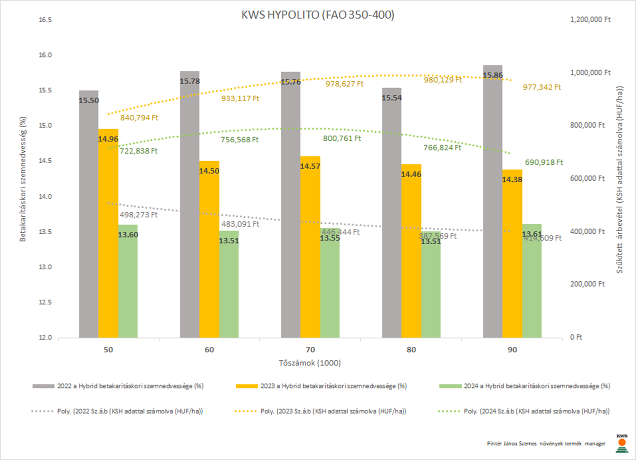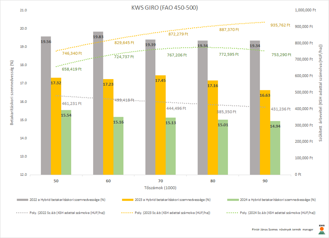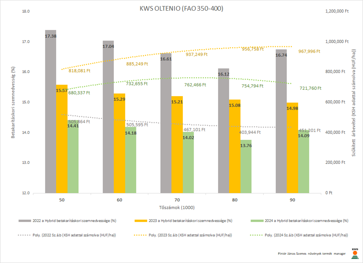 2024. volt az az év (5.77 t/ha országos termésátlag ~66.500 HUF kukorica felvásárlási ár), amikor a parcellák a legalacsonyabb szemnedvesség tartalommal lettek betakarítva. A KWS HYPOLITO-nál (FAO350-400) az öt tőszám szemnedvesség átlaga 13.56% volt és a legstabilabb, az öt tőszám szemnedvesség eltérése: R²=0.0048. A KWS HYPOLITO (FAO350-400) már 7 növény/m²-en (száb: 800760.9447 HUF-t) elérte. A másik, szintén ezzel vízleadás karakterisztikával rendelkező hibrid esetében a KWS FORTURIO-nál (FAO350-400) 7+1 növény/m² darabszám kellett ugyanilyen eredményességhez (száb: 800910.057 HUF-t). Ez azt jelenti hogy hektáronként ~10.000 szem vetőmag költséget megspórolhatunk helyes hibridválasztással, ugyanakkor növelhetjük a növények harmonikus térállását alacsonyabb környezeti terhelés mellett.